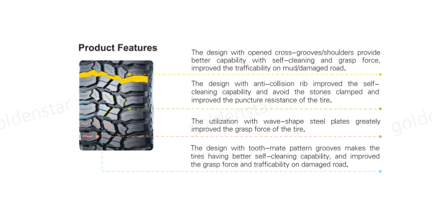 - The design with tooth-mate pattern grooves makes thetires having better self-cleaning capability, and improvedthe grasp force and trafficability on damaged road.